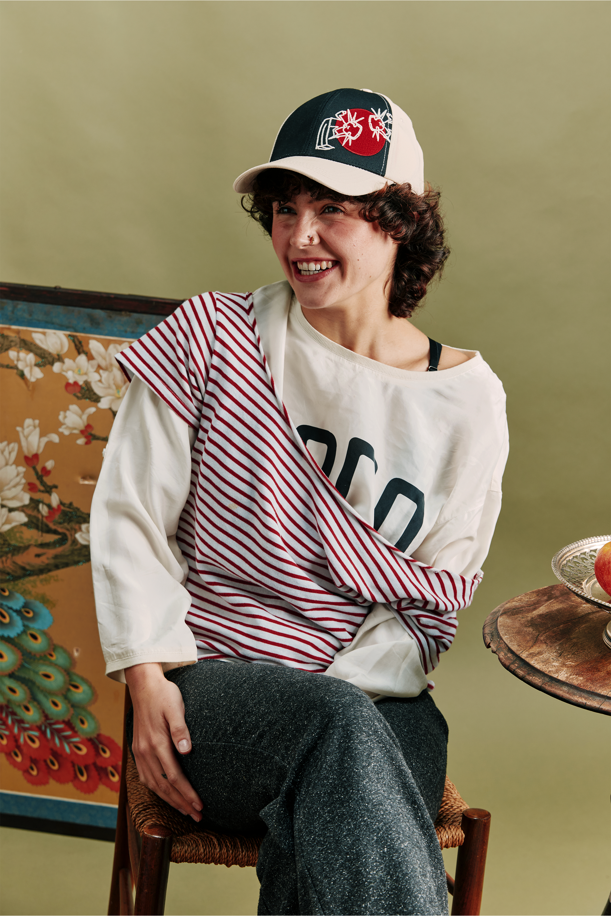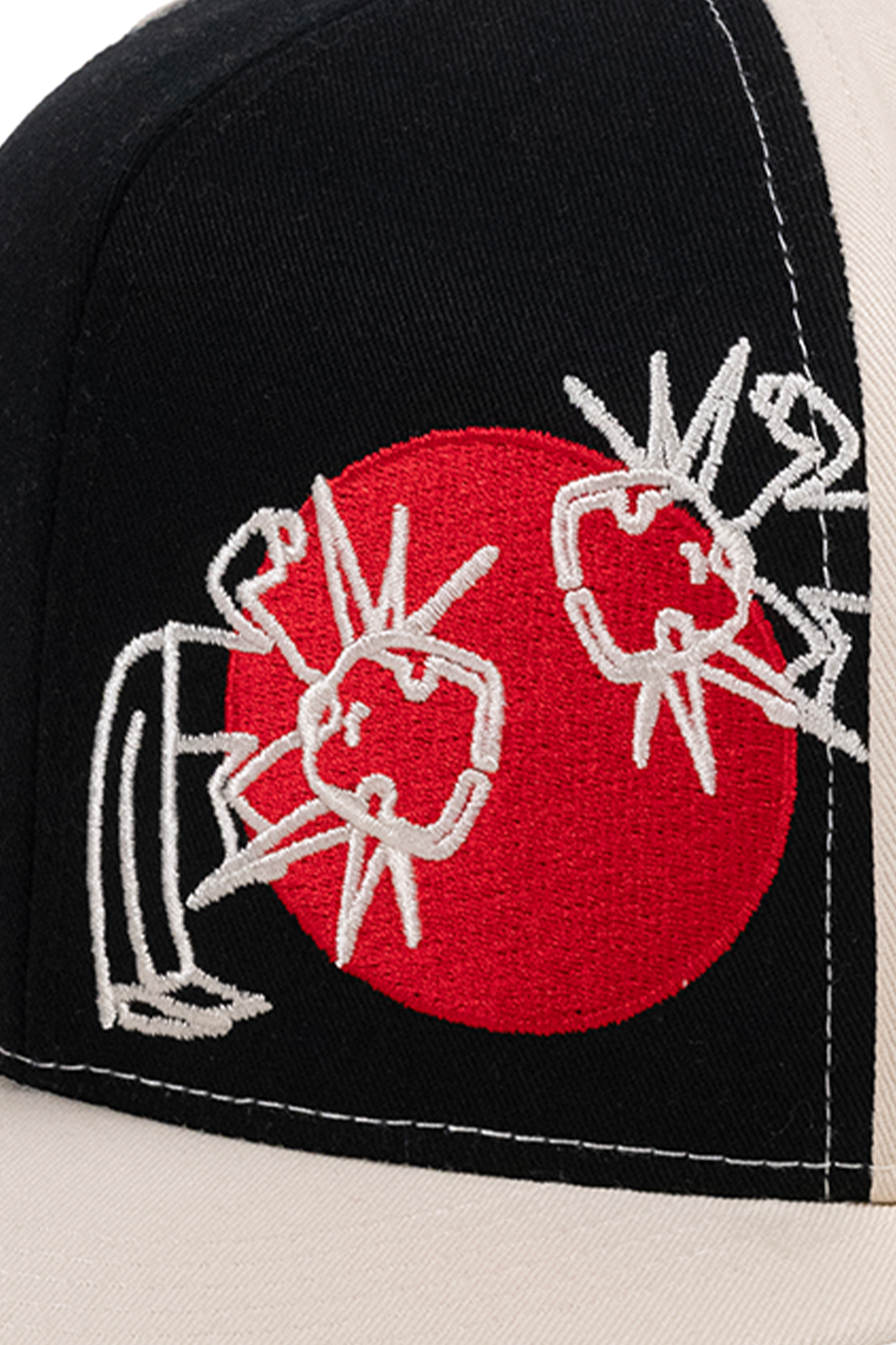 Adjustable Black and Off White cap with White and Red Embroidery.
